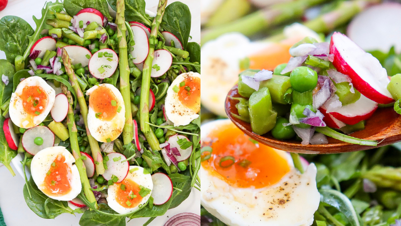 - Packed with texture — Tender asparagus, crisp radishes, silky eggs, and peppery greens in every bite.