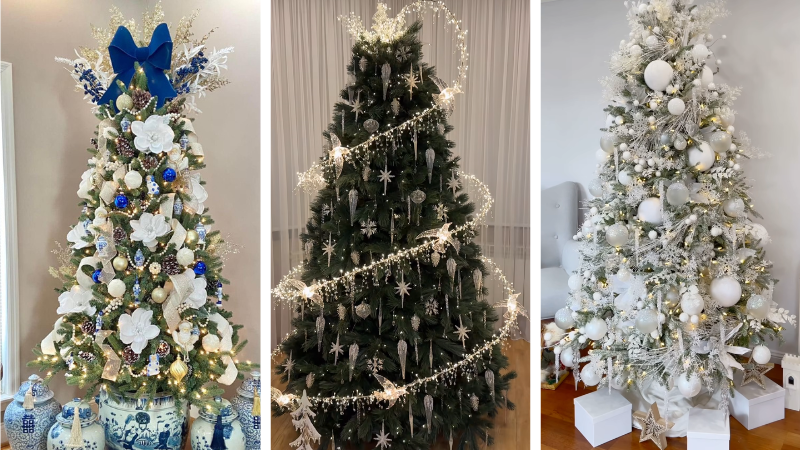 Cool blues and frosty whites turn this tree into a chic winter wonder. It’s icy, elegant, and perfect for channeling snow-queen energy.
